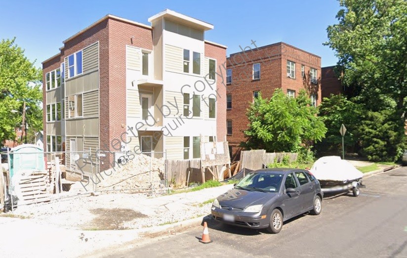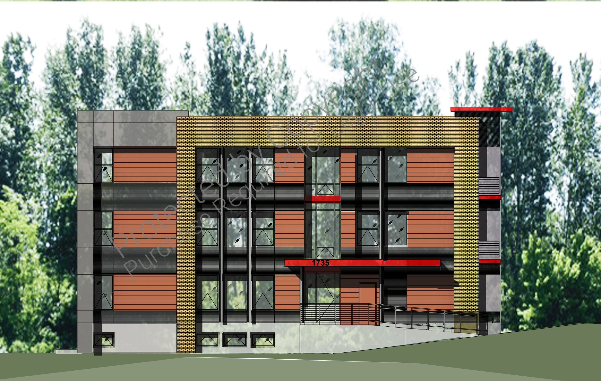 Modern design apartments 3 story with cellar level 8 units building with biking storage at 1st floor, entry lobby with canopy and ADA entrance ramp.