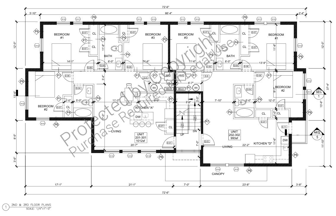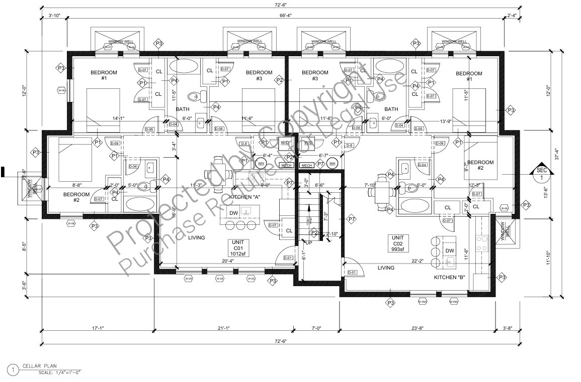 At the cellar level located two 3 badroom units with 6 total window wells to provide egress from all bedrooms.