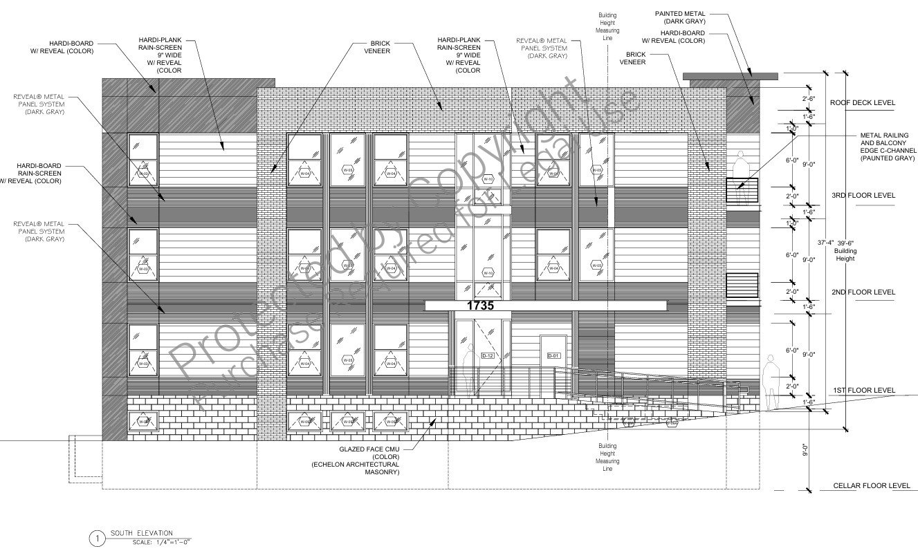 Architectural construction drawings permit set. Front facade rendering, built apartment pictures, screenshots ob building plans and facades.